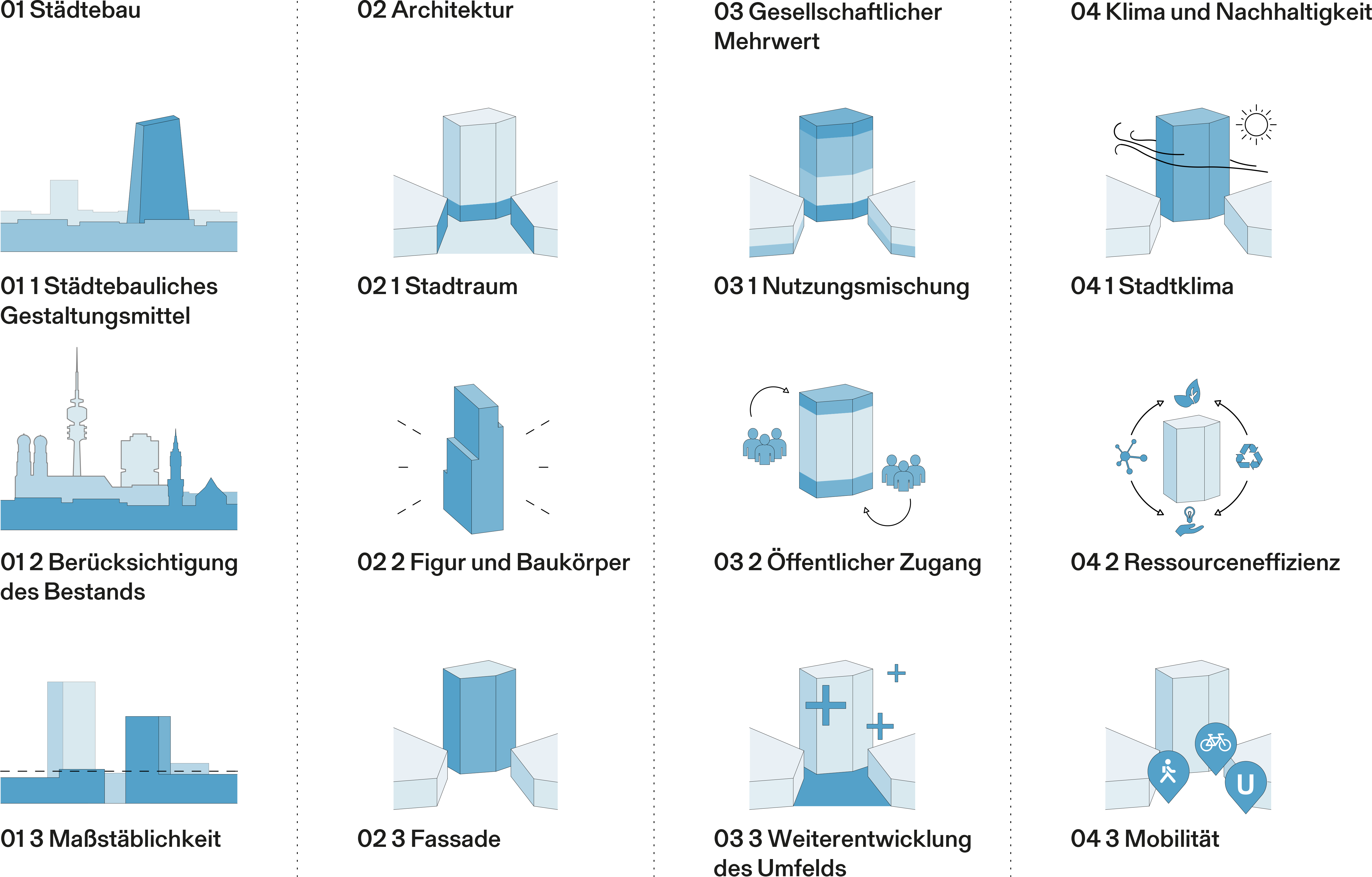 Qualität entsteht durch klare Regeln – Nur in einem transparenten und von der Stadtgesellschaft mitgetragenen Prozess ist es möglich, dass Hochhäuser von hoher städtebaulicher und architektonischer Qualität sowie einem gesellschaftlichen Mehrwert entstehen, und nachhaltig und klimagerecht umgesetzt werden können. Die Qualitätssicherung erfolgt in einem auf den jeweiligen Standort bezogenen, mehrstufigen Planungs- und Entscheidungsprozess.